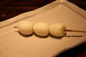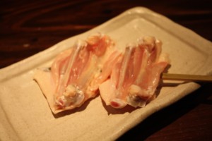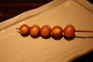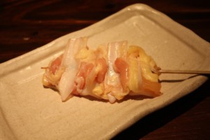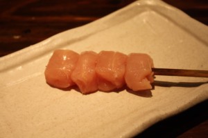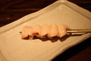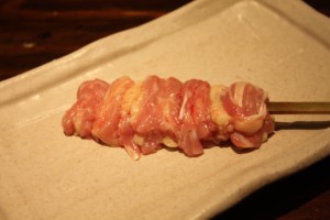串の先にぶらさがっている黄身の姿からこの名が付いたそうです。串の先に半熟のキンカン(鶏の腹卵)がちょうちんのようにぶらさがっている一品で、不思議に感じるかもしれませんがこれが実に美味しくて、濃厚な「きんかん」は焼いてもたまらなく美味しい部位です。ユーモラスな形で女性に人気があります。興味がある方は、是非一度ご堪能ください。