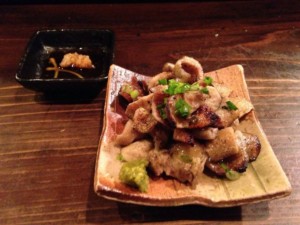| とりわさ | 地鶏の皮炭火焼 |